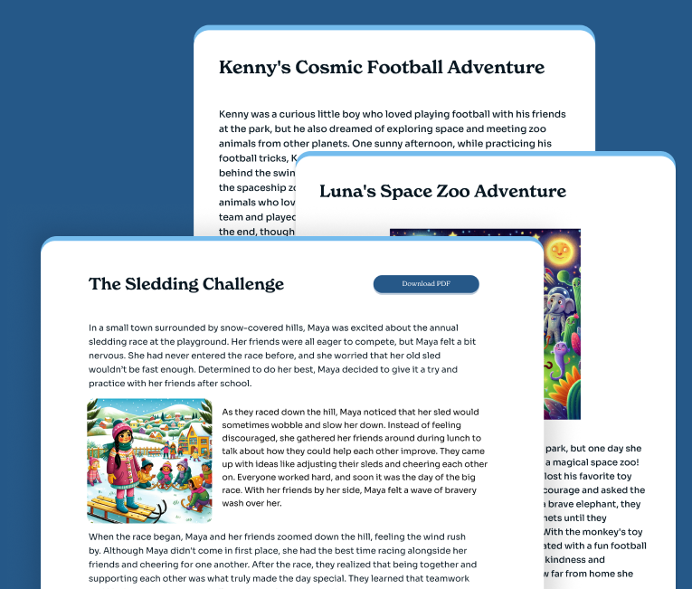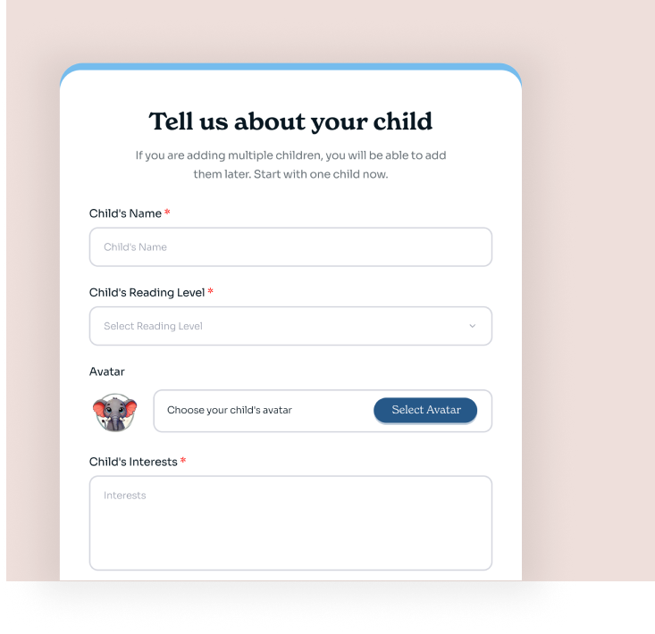 Crafting the child's profile is as enchanting as waving a wand. Log in and provide their name and reading level with just a few clicks. Specify the child’s interests (from sports to science, fiction, and non-fiction) to ensure every story they receive aligns with their reading ability.